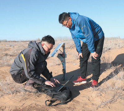 Researchers from the Experimental Center of Desert Forestry under the Chinese Academy of Forestry (CAF) collect soil moisture data in Dengkou county, Bayannur city, north China's Inner Mongolia Autonomous Region. (Photo courtesy of the Experimental Center of Desert Forestry under the CAF)