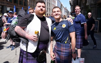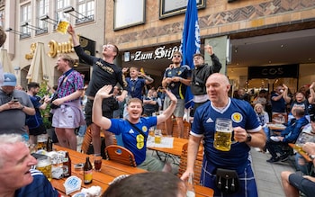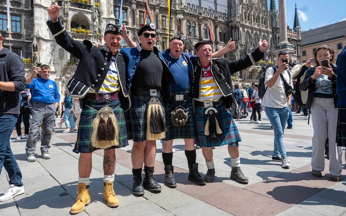 Read moreSome had arrived from as far afield as Australia while others had taken for flights across Europe on their journey or travelled by caravan.But by far the biggest entrance was Craig Ferguson,20,who walked 500 miles,and 500 more,after setting off from Hampden Park in Glasgow on foot 41 days ago.On arrival he was showered with champagne and handed bottles of Buckfast as the Scotland party entered full swing.Mr Ferguson joked that he had “brought the Scottish weather with me,” as he arrived in the Munich sunshine.“It was incredible,this is officially my 15 minutes of fame,” he said as the bottle of Buckfast he had been given fell and smashed on the ground.“I’m a bit tired but I could have kept going. It was taken out of my control what I’d be doing when I got here. I came in and I was having bevvies before I crossed the finish line. Us Scotland fans now just have to let our hair down and enjoy it because we don’t get to enjoy it very often.”Craig Ferguson (right),who has walked from Scotland to Germany for Euro 2024 at Marienplatz central square,MunichCredit: Martin Rickett/PAMr Ferguson,who raised £50,000 for charity,initially did not have a ticket to the game but has now been given one by a supporter.“I think it makes the walk and all those miles a little bit less crazy the fact that I will now actually be going to the game,” he said.“I started this journey with just me,my bag,no ticket,no nothing,Just a stupid idea and well,fast-forward,you know,41 days,here I am.”The bars are not the only thing drying up. Scotland’s kiltmakers are bemoaning a lack of tartan as thousands snap up “drinking kilts” for the tournament.Some outfitters have “completely run out” of stock as canny fans opt for ex-hire kilts,a cheaper alternative to the traditional dress.David Hughes,62,owner of Bowdens,in Leith,Edinburgh,said he has been forced to turn eager buyers away after he ran out of stock last week.He said: “We have completely run out. I’m turning guys away,two or three a day,asking for an ex-hire kilt. It’s brilliant for business,I just wish I had more. We ran out about a week ago.“On average an ex-hire kilt is anything between £100 and £150 and we have sold about 45 kilts. This is actually the best it’s ever been for us because it’s been such a long time since Scotland were actually in a tournament.”Ken MacDonald,65,owner of Kilts for Hire Paisley,also known as the Houston Kiltmaker in Paisley,said: “Basically,a lot of folks have got good kilts and they don’t want to take their good kilts with them,so they are happy to buy an ex-hire kilt or what we would call a drinking kilt.”Meanwhile,back in Munich,others to descend this morning were Shaun Barber,61,and his two sons Kyle,37,and Grant,35,who came from Dundee and were met by Mr Barber’s daughter Jess who had made a surprise decision to join them from Melbourne.None had slept as they drank pints in Marienplatz at 10am,after a few vodkas on the train overnight from Frankfurt.“We’d just got here when I got a tap on the shoulder and it was Jess,over from Australia,” Mr Barber,a retired sales director from Dundee,said.“I didn’t know anything about it. It was the best weekend ever. I know we’re going to beat Germany but now that’s not even the highlight. At some point we will need to find a hotel.”Scotland did qualify for the last European Championships but Covid restrictions meant fans were unable to go on tour across Wembley.“There’s a lot of fountains here,it’s going to be like Trafalgar Square on steroids,” Mr Barber said,referring to previous antics by Scotland fans who put washing up liquid in the fountains around Nelson’s Column.“This is the first time Scotland have been on tour since France 98,it’s the biggest party in 26 years. We are going to go home after the group stages and then we will be back to see Scotland in the final.”His daughter added: “I only decided to come two weeks ago,two flights,two trains but it’s worth it.”Tartan Army fans in Marienplatz. 'If there's no Scotland,there's no party',they saidCredit: Paul Grover/TelegraphOthers had taken over a business class flight from Dubai on their way here after a surprise upgrade saw several Scotland fans find themselves at the bar of an Emirates plane.“It’s been trains,planes and automobiles and now beer,” said one person on board,while his friend added: “I’m not sure I can put a price on this trip,don’t tell the wife.”They were sat next to Michael Wallace,41,who had taken son Evan,14,who was discreetly having a stein of Radler,and had travelled from Edinburgh via Stockholm,who added: “It’s a beer town,Scotland will drink its fair share of it. If there’s no Scotland,there’s no party.”Throughout the day locals were treated to Tartan Army lyrics including  “Diego Maradona,he put the English OUT,OUT,OUT”,numerous renditions of the Proclaimers and endless versions of Flower of Scotland on the bagpipes.“We have every bit of hope about the game,” Stephanie Phinn,34,who was with her wife Lizzie,in her late 30s,and friends said.“These are better than we get in Glasgow,” she said as her wife and friends drank their latest stein. “Look around us,how good is this.”While the German football team may be less easy going tomorrow,locals were enjoying the company of this week’s tourists including Helmut Wanner,dressed in traditional German clothing,who decided to join in with the Scottish fans chants.“Kein Schottland,keine Party,” he said to the delight of those wearing blue and white around him.