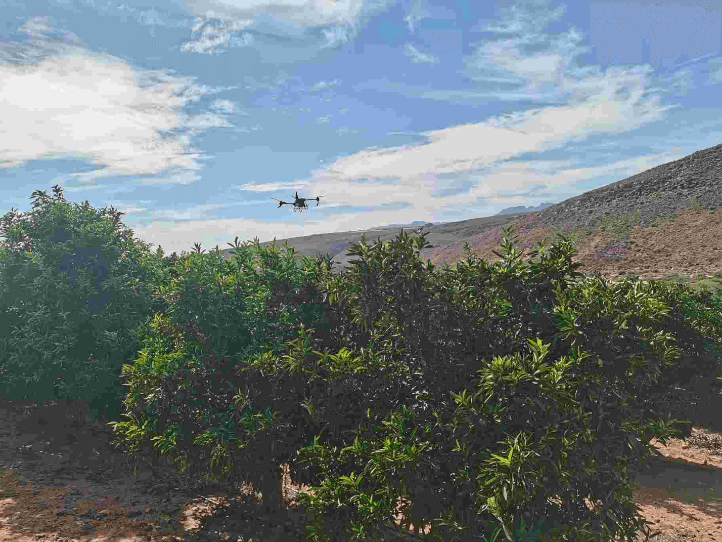 Orchards often feature challenging terrains, including steep slopes that are difficult for ground sprayers to access. In contrast, the DJI Agras drones excels in such environments, navigating terrain with slopes up to 50°, making it an adaptable spraying tool for all types of landscapes. Additionally, the drone maintains a consistent flying speed even over rugged terrain, ensuring uniform fly bait coverage across the canopy. This is in stark contrast to ground sprayers, whose speed and coverage are highly dependent on the flatness of the terrain.