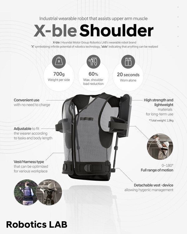 Hyundai Motor and Kia unveiled the X-ble Shoulder at Wearable Robot Tech Day held at the Hyundai Motorstudio Goyang near Seoul. The X-ble brand — a combination of 'X,' symbolizing infinite potential,and 'able,' indicating that anything can be realized— heralds a new era in wearable technology.