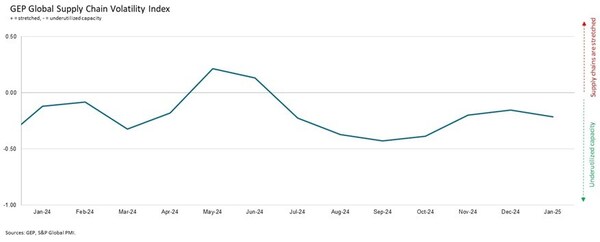 CLARK,N.J.,Feb. 12,2025 --The GEP Global Supply Chain Volatility Index— a leading indicator tracking demand conditions,shortages,transportation costs,inventories,and backlogs based on a monthly survey of 27,000 businesses — posted -0.21 at the start of the year. This indicates that global supply chains are effectively at full capacity,signaled when the index hits 0.