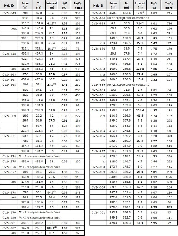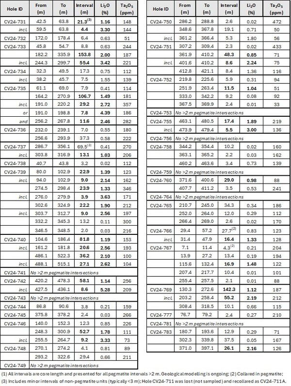 100.5 m at 1.06% Li2O,including 15.0 m at 2.25% Li2O (CV24-730).