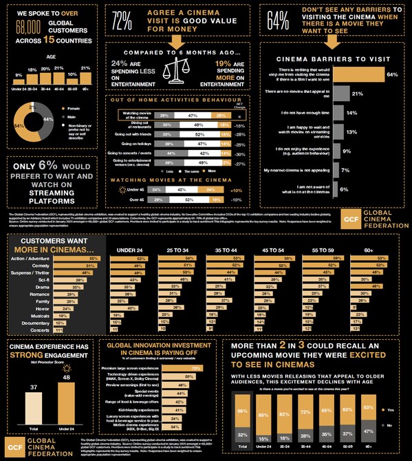 SYDNEY,March 20,2025 -- The Global Cinema Federation (GCF),representing global cinema exhibition,is excited to announce the results of its latest global customer research,highlighting the voices of consumers worldwide. The GCF was created to support a healthy global cinema industry. Its Executive Committee,currently chaired by EVT CEO Jane Hastings,includes CEOs of the top 12 exhibition companies and two leading industry bodies globally,supported by an Advisory Board which includes 75 exhibition companies and 29 associations. Collectively,the GCF represents approximately 65 -70% of global box office.