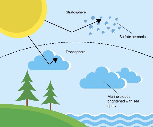 This graphic shows ways in which dimming the sun could potentially work (Picture: Getty Images)