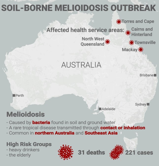 Map shows where rare tropical disease Melioidosis has killed 31 people across Australia (Picture: Supplied/Metro)