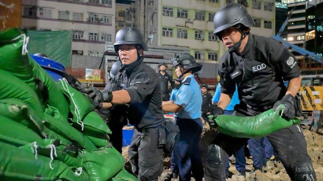 A bomb disposal squad diffuse a WWII bomb found on a building site in Hong Kong on Friday (Pic